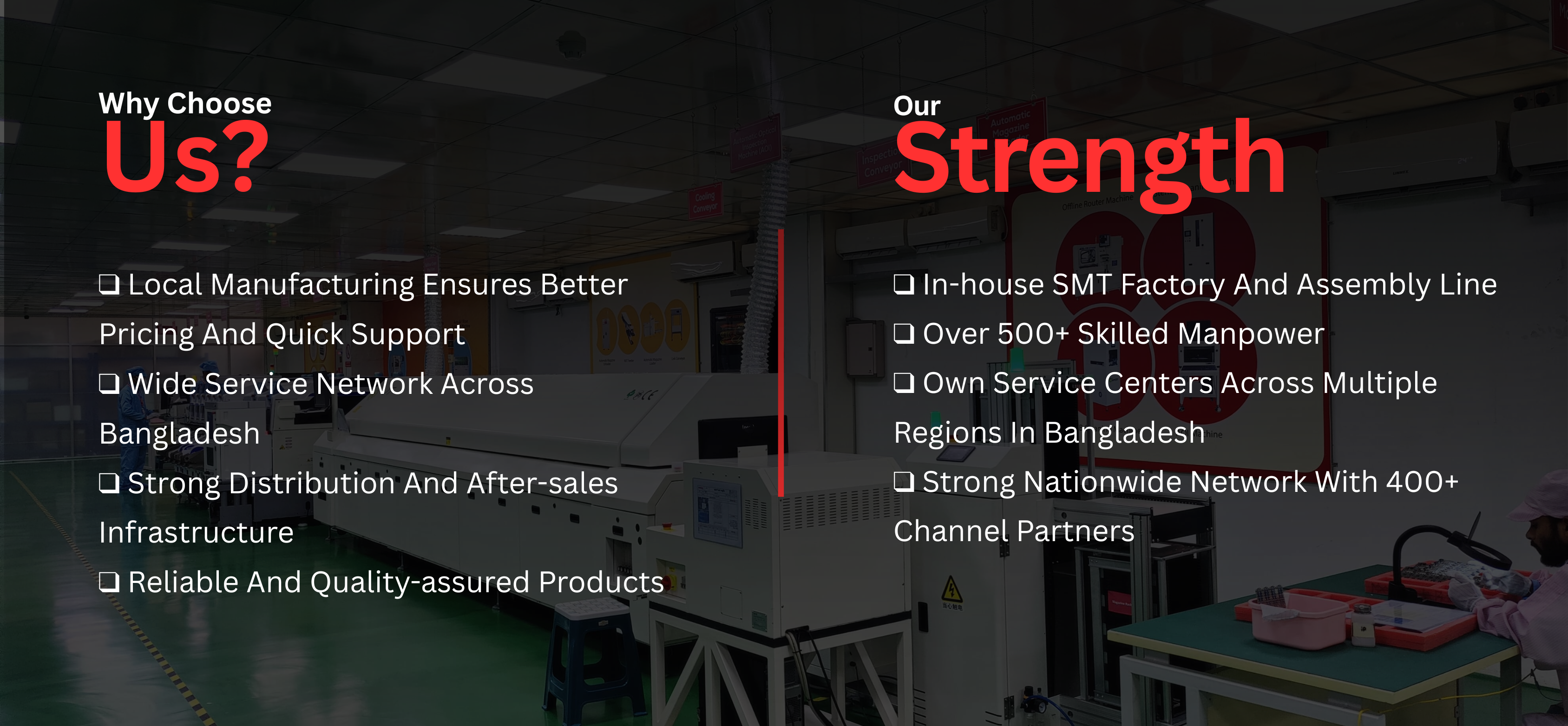 Founded in 2016, our state-of-the-art mobile phone factory in Bangladesh specializes in the production of mobile phones, chargers, and batteries. With in-house SMT (Surface Mount Technology) and advanced assembly facilities, we maintain complete control over quality and innovation — ensuring that every product meets our high standards before reaching your hands.