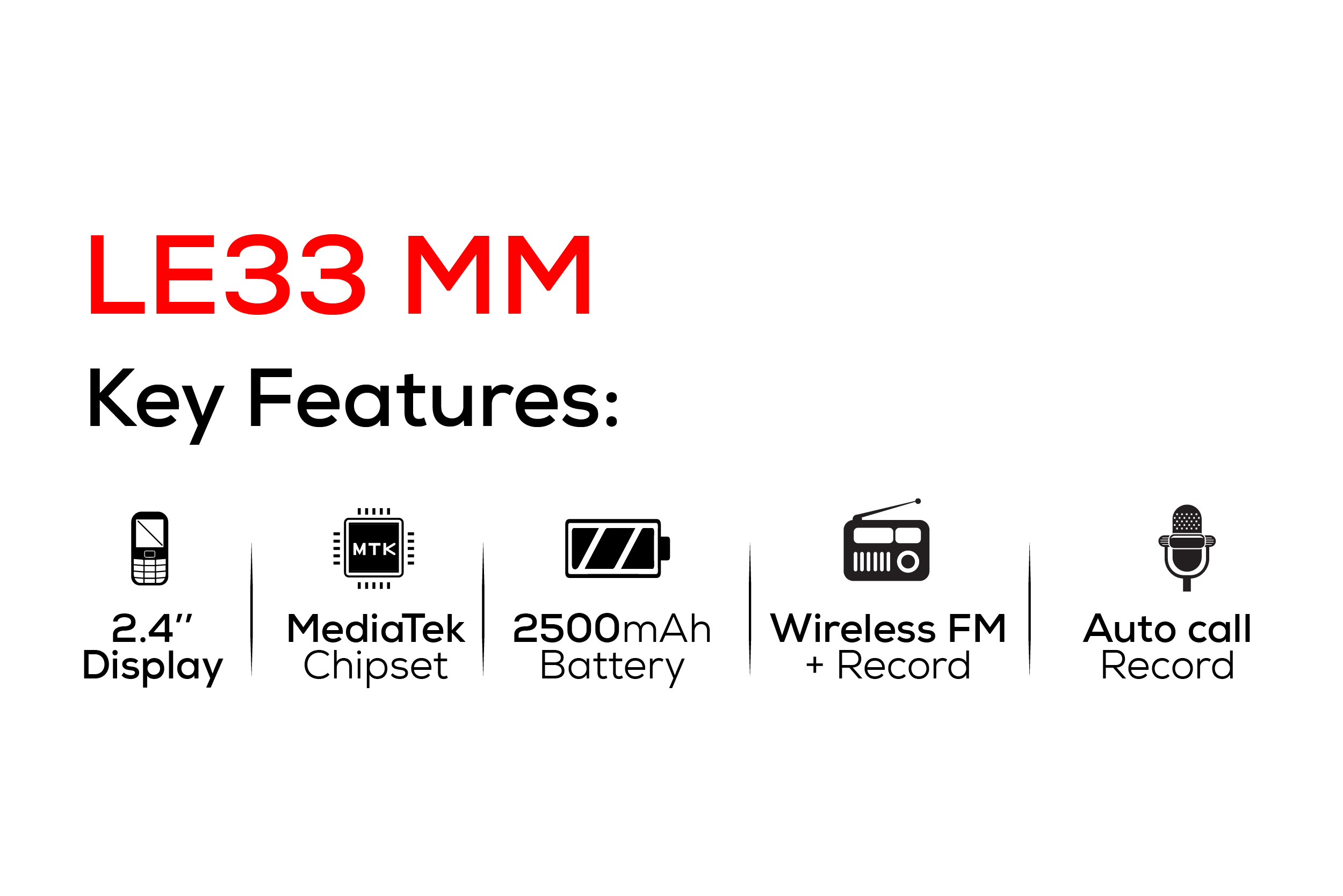 This phone offers a larger display, long-lasting battery, and essential features including FM radio, recording, and Bluetooth connectivity.